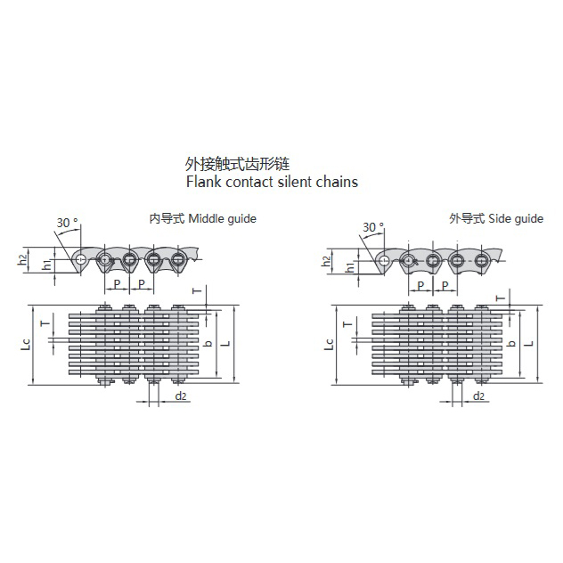 - Chaîne dentée à maillage externe: Le profil de la denture droite extérieure de la plaque de la chaîne s’engrène avec les dents du pignon pour un fonctionnement stable. Remarquable pour ses effets polygonaux plus importants, l’augmentation des chocs, des vibrations et du bruit.