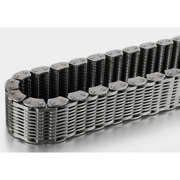 - Chaîne silencieuse à axe rond pour les systèmes d’entraînement principaux dans les boîtes de dérivation et les boîtes d’engrenages.