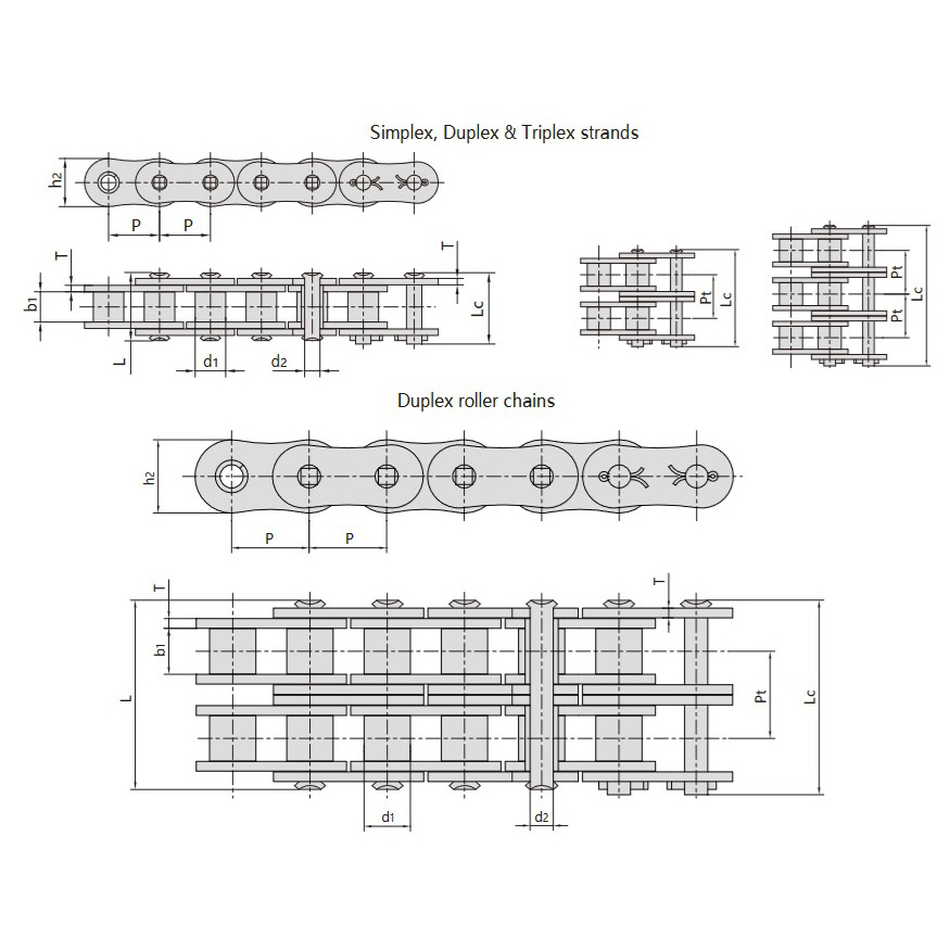 - Dimensions standard: Les dimensions paramétriques sont identiques à celles des chaînes à rouleaux de la série Heavy Duty, ce qui facilite l’interchangeabilité.